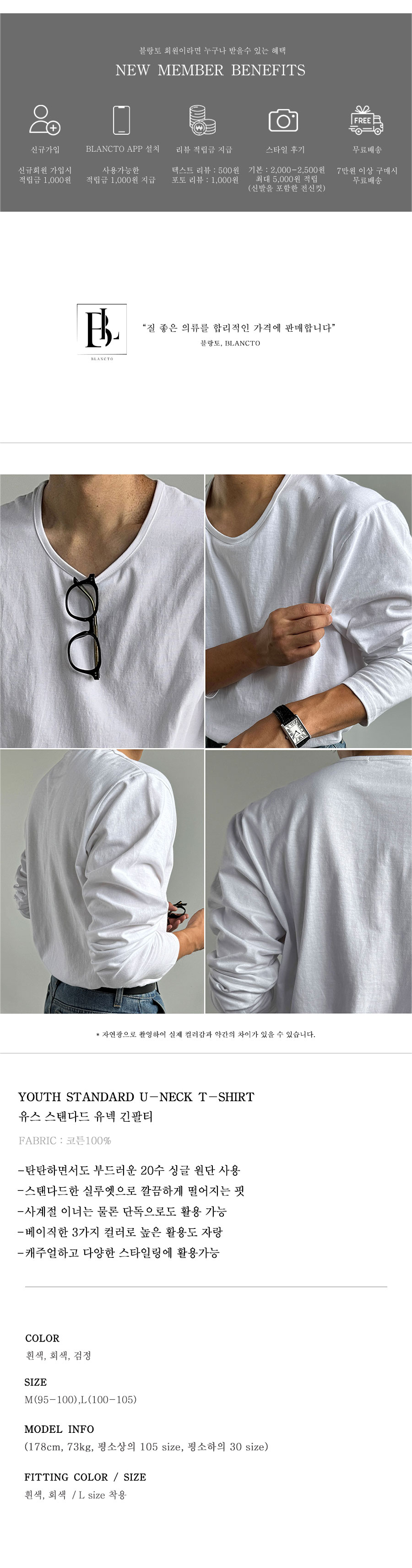 가성비는 물론 깔끔하게 떨어지는 기본핏감으로 활용도가 높은 유넥 긴팔티.