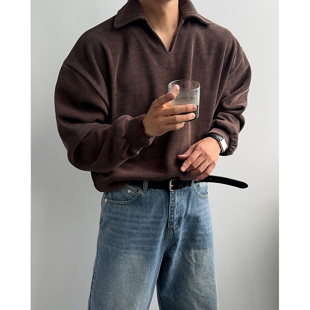 답답함 없는 오픈카라와 골지 디자인으로 고급스러운 무드를 살린 긴팔티.