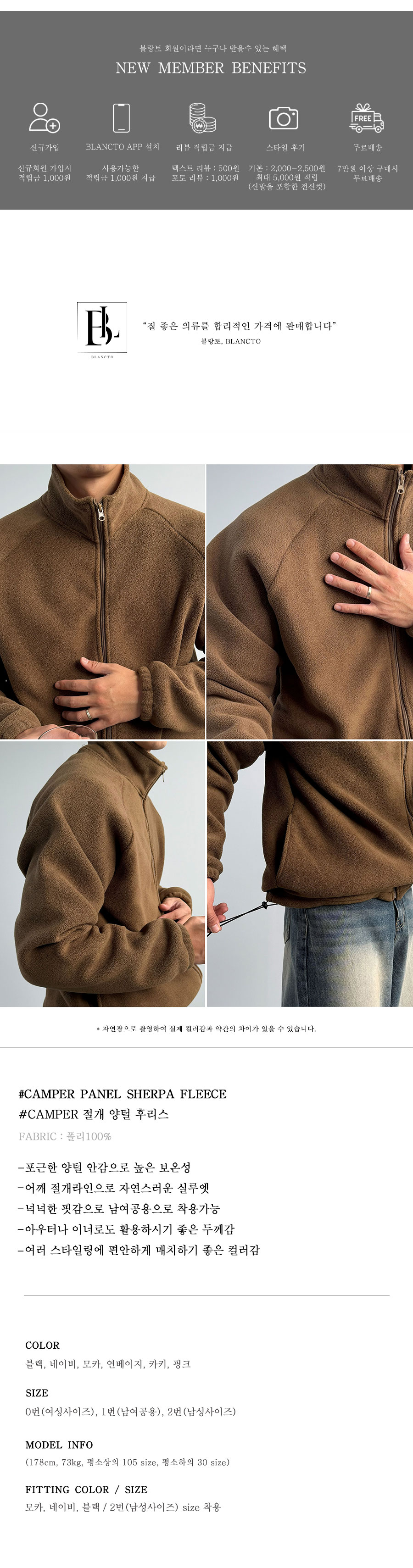 뛰어난 가성비를 자랑하는 후리스 집업으로, 아우터나 이너로도 활용 가능한 적당한 두께감이 특징입니다.