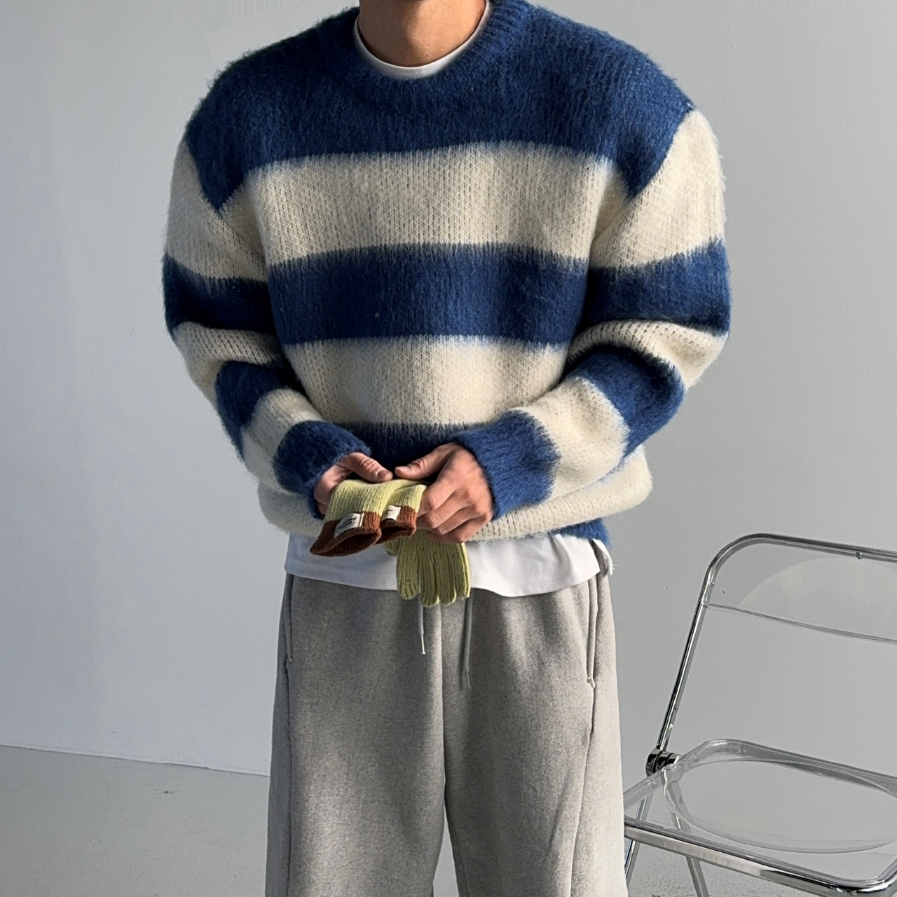 도톰하면서 덩치가 좋아 보이는, 브러쉬 단가라 니트입니다.