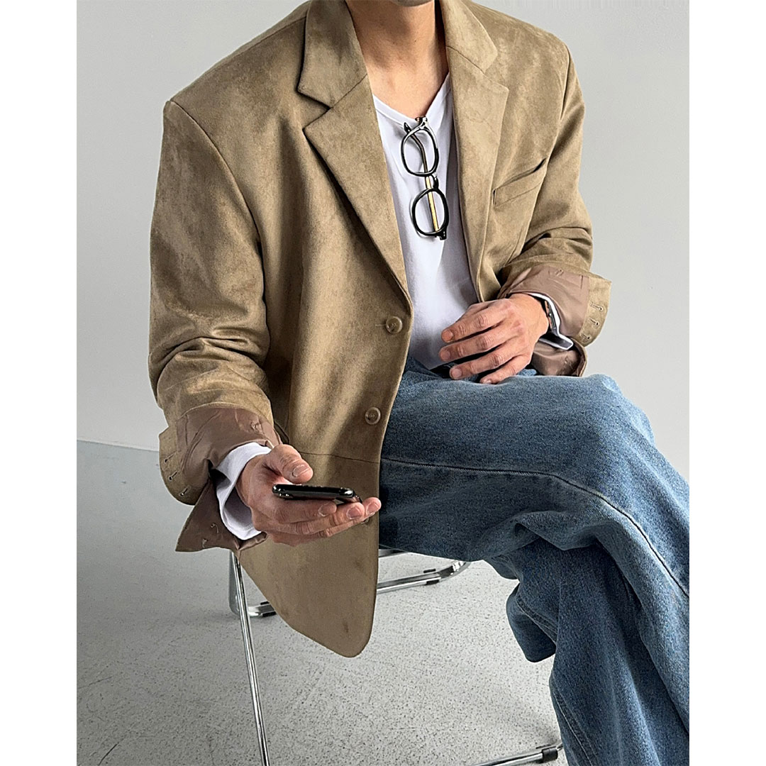 어깨가 넓어 보이는 핏. 매트한 느낌이 매력적인 스웨이드 자켓.