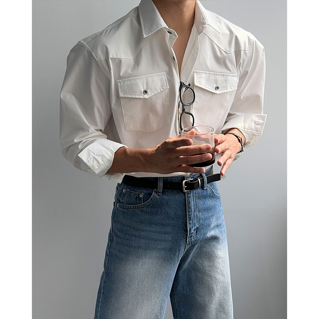 각을 살려주는 원단과 웨스턴 디자인으로 남성적인 무드를 담은 셔츠.