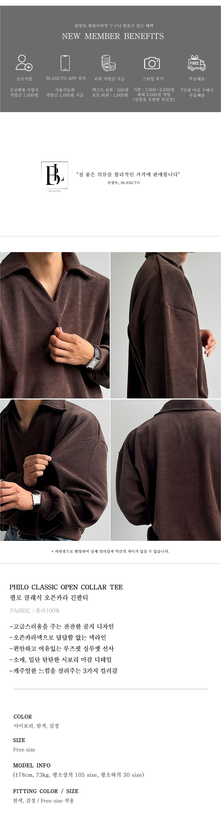 답답함 없는 오픈카라와 골지 디자인으로 고급스러운 무드를 살린 긴팔티.
