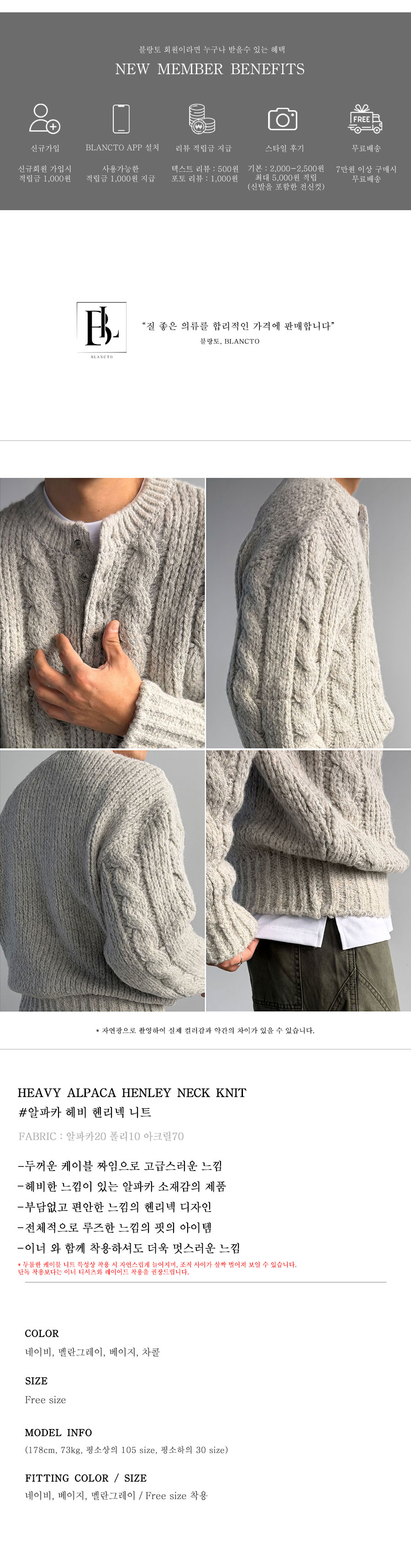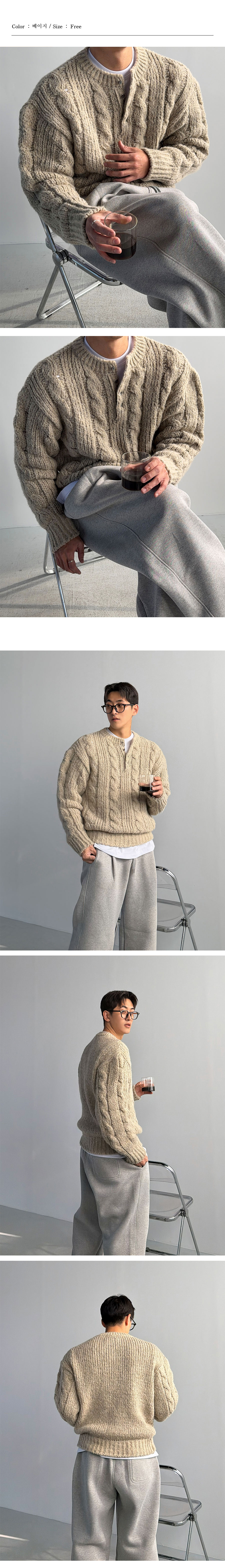 헤비알파카 소재의 고급스러운 질감과 케이블 짜임이 돋보이는 헨리넥 니트입니다.