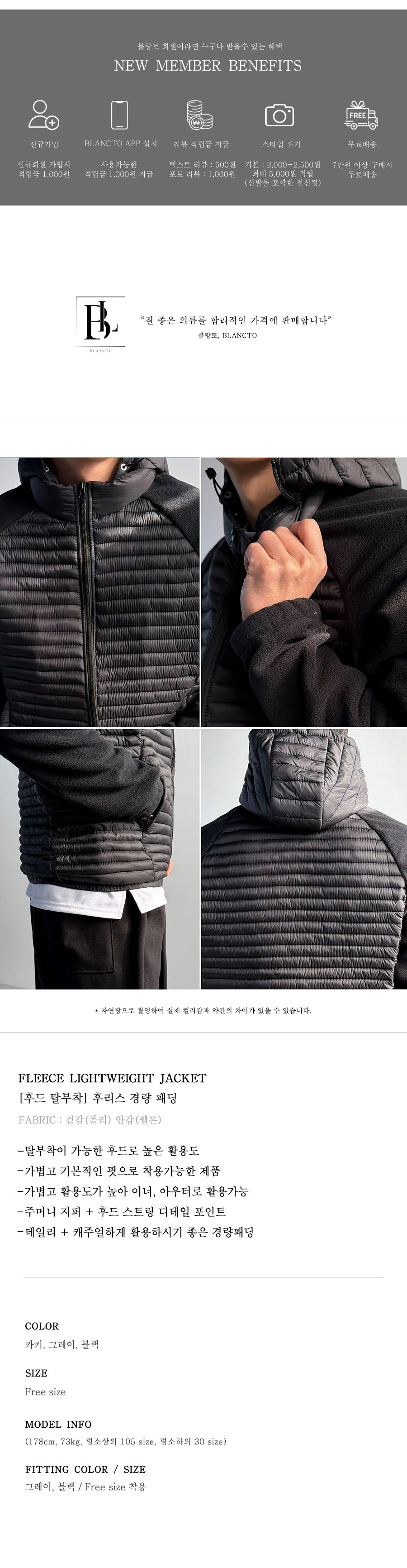 후리스 + 경량패딩의 조합. 가볍고 스탠다드한 핏의, 활용도 높은 가성비 경량 패딩.