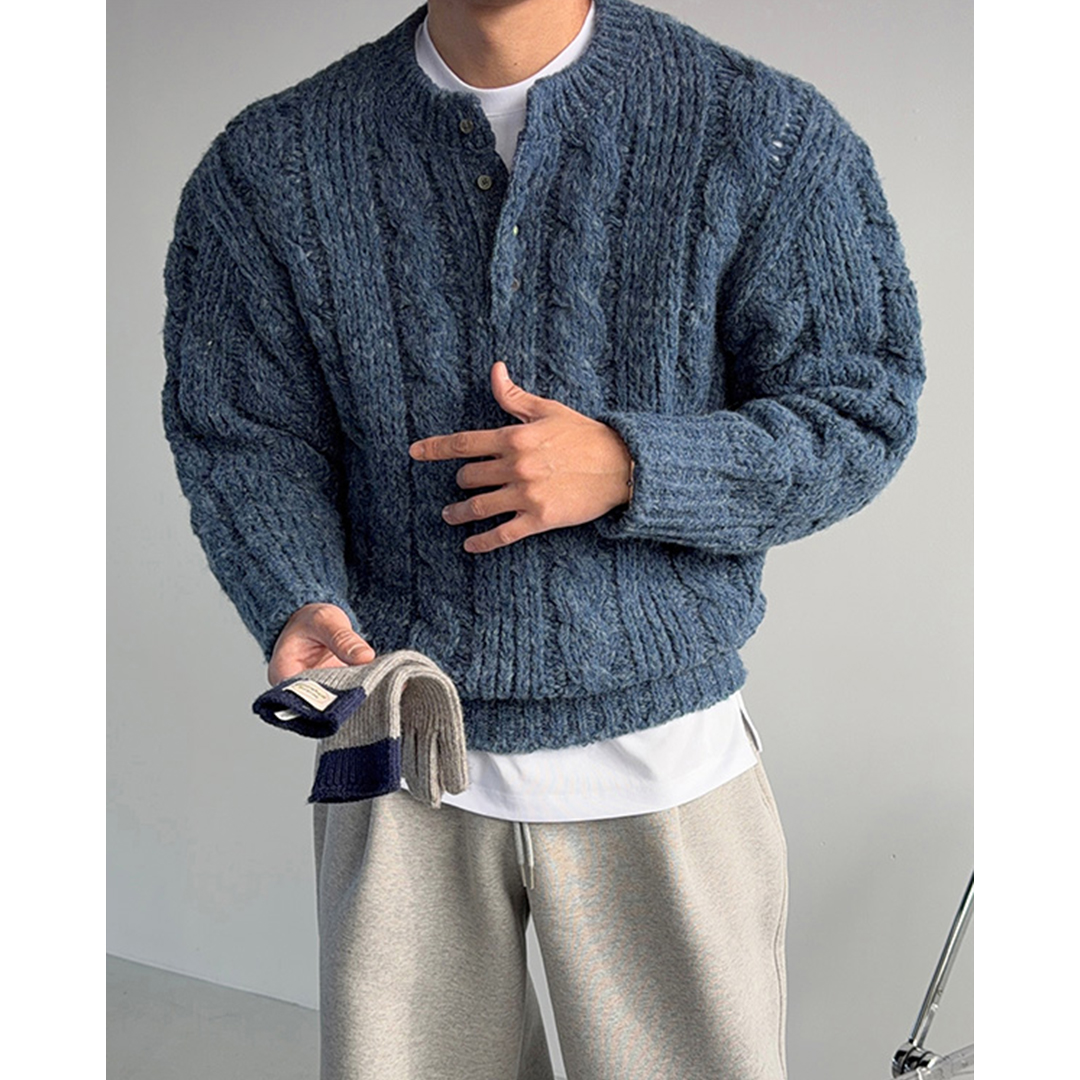 헤비알파카 소재의 고급스러운 질감과 케이블 짜임이 돋보이는 헨리넥 니트입니다.