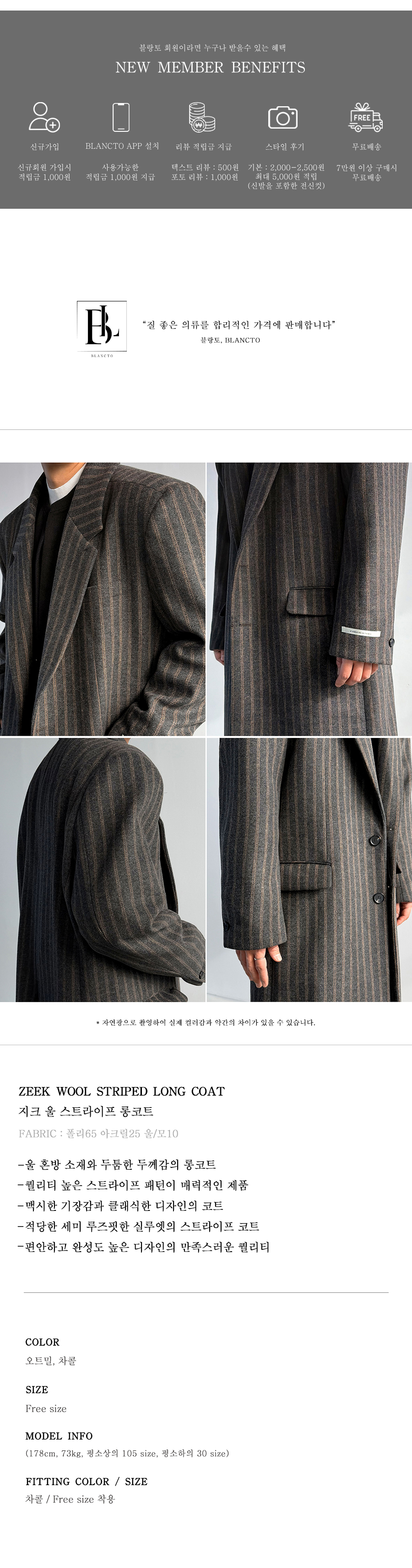 완성도 높은 스트라이프 패턴과 여유 있는 롱 기장으로 클래식하면서도 고급스러운 무드를 연출하는 울 코트입니다.