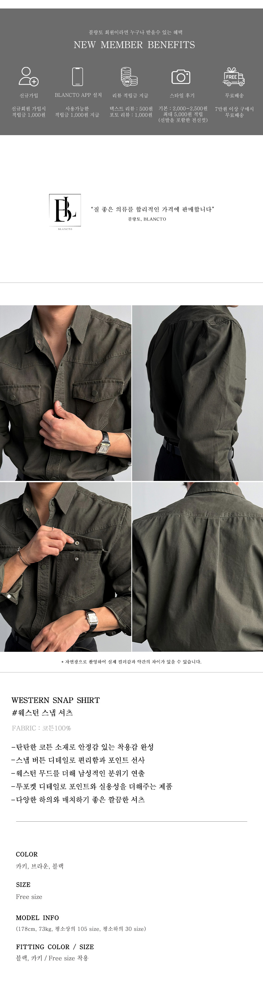 웨스턴 디테일이 돋보여 남성적인 무드를 완성하며, 스냅 버튼 디테일로 실용성까지 갖춘 셔츠입니다.